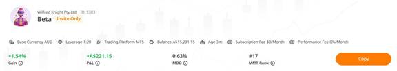 On the Tradingcup leaderboard filled with top performers, Wilfred Knight Pty Ltd is not the kind of trader whose results make people shout “insane operation!” at first glance. Over the past three months, the total return of its trading signal Beta is only about 1.53%. It looks neither aggressive nor eye-catching, yet it quietly climbed into the MMR Top 20.