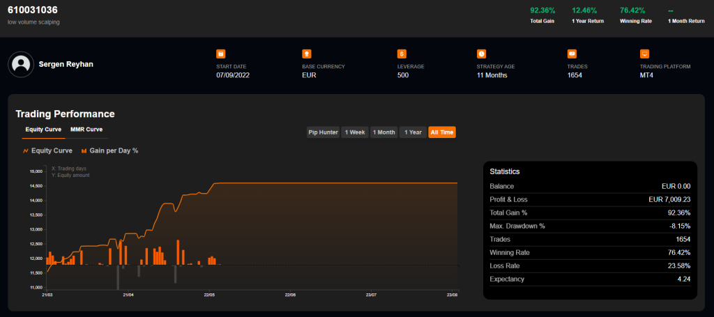 Today, we set out on an intriguing journey into the heart of Sergen‘s low volume scalping strategy, casting a spotlight on his remarkable skill in risk management and his strategic exposure diversification within the realm of the USD. What has undoubtedly caught my attention is the astounding achievement of a 92.36% gain in under 5 months, all stemming from an initial deposit of €11,500.