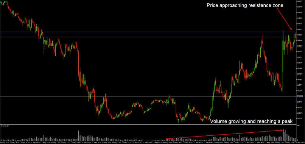 Sergen’s first task involves vigilant monitoring of the trading volume. Recognizing that he intends to capitalize on a potential reversal of the prior market movement, he readies himself for a contrarian approach. In this instance, Sergen positions himself for a short or selling position. This strategic manoeuvre hinges on the principle that a resistance level often triggers a shift in market sentiment, leading to downward price movement.