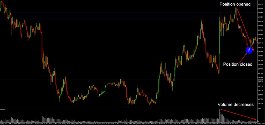 In tandem with this, Sergen’s second task involves exercising patience once again. While his position is set, he refrains from hasty actions. Instead, he remains watchful for a reduction in trading volume. This decrease in volume signifies a potential transition from heightened selling pressure to a more stabilized market environment. Sergen interprets this as a cue to contemplate closing his position, aiming to capture the price movement he had anticipated.