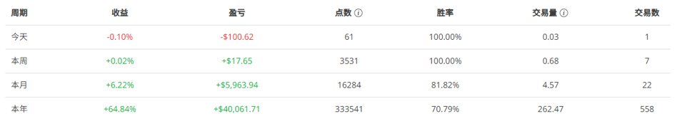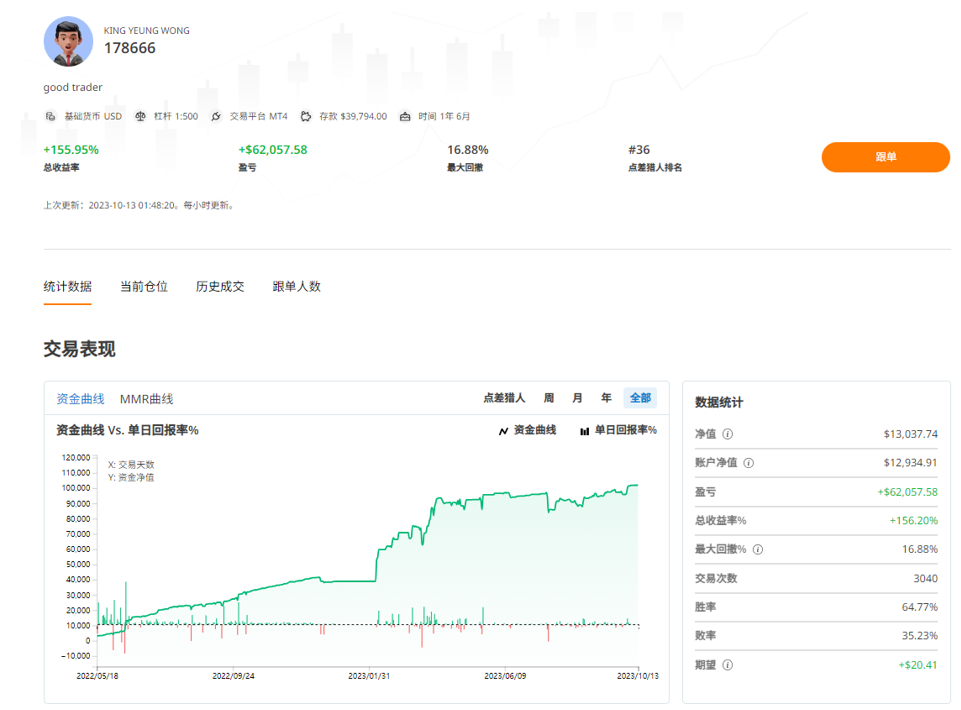 KING YEUNG WONG凭借着优秀的风险控管能力,一旦发现走势和原先进场规划的不一样,能及时认错,让他即使有100%以上的收益率,还是能把最大回撤维持在20%以内,若接下来能继续保持这样的操作方式,MMR要挤进前5名应该是指日可待。