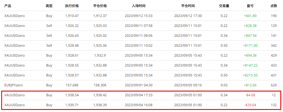 我们将目光放到KING YEUNG WONG的风险管理策略,在9月4日的黄金交易中,该交易者持仓不到一天,随即发现黄金的走势几乎原地盘整了5个小时,就果断地把这几笔做多的黄金交易平仓,从结果来看确实规避了走势继续向下的风险,也验证了当交易入场后发现情势不对,要有随时砍掉部位的决断力