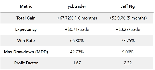 Key Insight: Jeff Ng’s higher expectancy and lower MDD suggest better risk-adjusted returns, but ycbtrader’s longer track record adds stability.