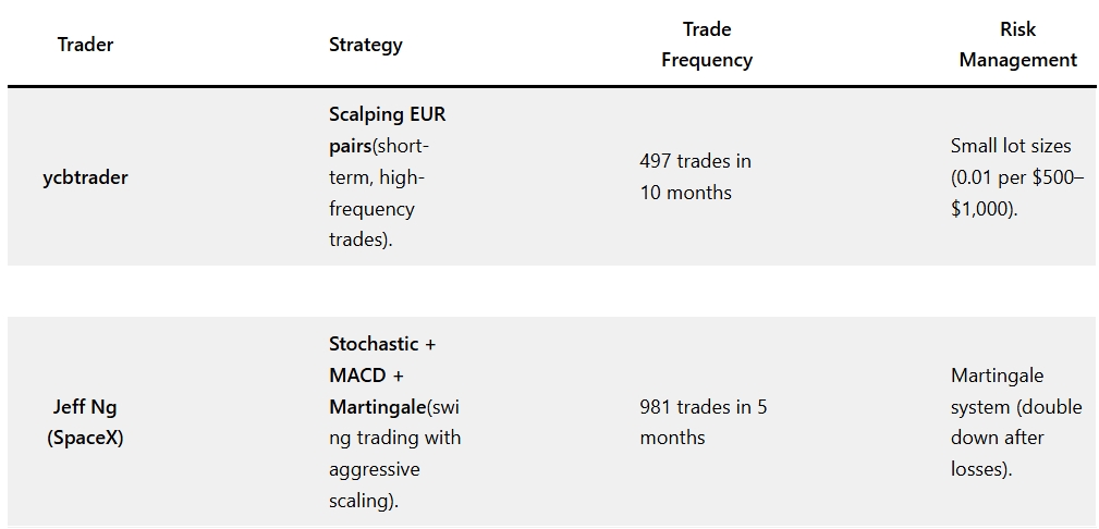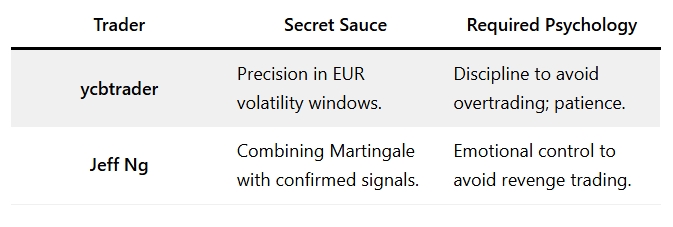 • Strategy Fit: ycbtrader suits those seeking steady, small gains and who can tolerate (or mitigate via capital allocation) the high historical MDD. Jeff Ng appeals to those seeking higher potential returns and comfortable with the inherent risks of Martingale, trusting his specific implementation and the lower observed MDD so far.
