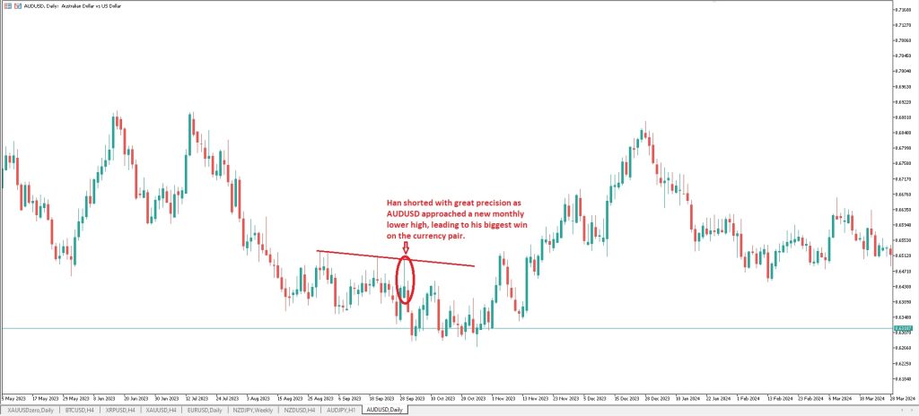 Han shorted with great precision as AUDUSD approached a new monthly lower high on September 29, 2023, leading to his biggest win on the currency pair. This proves his pullback strategy.