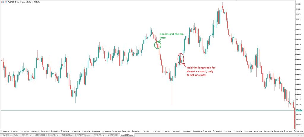 In the following year, Han bought the dip on July 19, 2024, just to hold the long trade for almost a month then only to sell it at a loss!