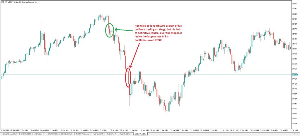 He tried to long USDJPY as the core part of his pullback trading strategy, but his lack of definitive control over the stop loss led to the largest toss in his portfolio – over -$700!