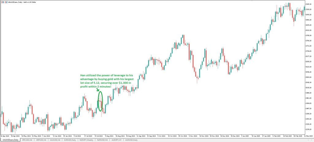 Han utilized the power of leverage to his advantage by buying gold with his largest lot size of 5.12, securing over $1,300 in a single trade profit within just 2 minutes!