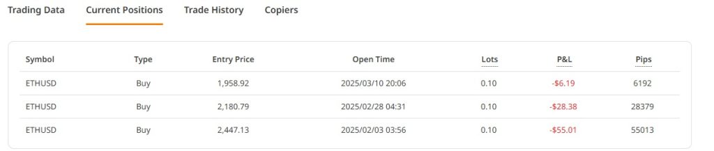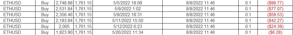 One of his worst-performing instruments was on Ethereum trades. These trades were all stuck positions, held for more than three months, and, worse, all ended in losses.