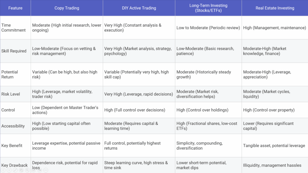 - It’s Not a Replacement for Diversification: Don’t put all your investment eggs in the copy trading basket. Maintain a balanced portfolio across different asset classes (stocks, bonds, real estate, etc.) based on your overall financial goals and risk tolerance.