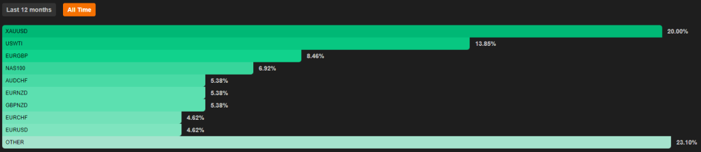 Let’s take a closer look at Jahed’s portfolio allocation. Notably, his most frequently traded asset is gold (XAUUSD), accounting for 20% of his allocation. Gold presents an attractive risk-return profile, provided you effectively manage your risk. It offers an excellent opportunity to expand your portfolio by scaling positions. However, it’s essential to remember to add new positions when you’re in profit. Otherwise, you risk accumulating negative exposure to the market, forcing you to increase your risk with each new position.