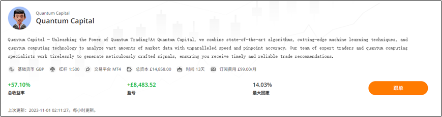 我们点选Quantum Capital之后,可进到该策略的主页面如下图2,这边可以看到此带单交易者针对此策略的简要叙述。