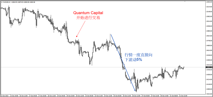 但Quantum Capital所选择的NAS100,本身的趋势性较强,若单纯使用马丁格尔,很容易因为单边行情而爆仓。所以这边可以推断Quantum Capital应该不是使用马丁格尔,因为从10月20日该策略开始进行交易以来,纳斯达克100一度直接下跌将近5%(如下图4),这种波动使用马丁格尔的下单方式无疑是给自己找麻烦。