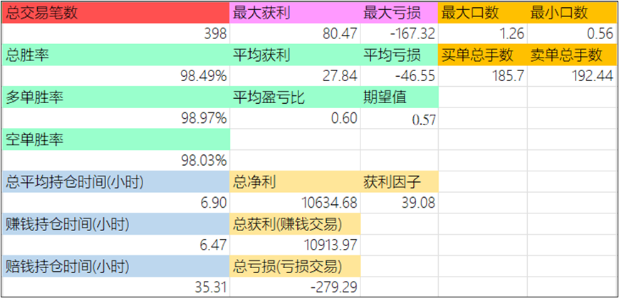 最后来看看目前Quantum Capital已平仓交易的详细统计数据,如下图7,虽然平均盈亏比只有0.6,然而胜率将近99%,令人咋舌的高,足以令其累积10,634.68的获利;买卖单手数相当平衡,可见10月20日以来NAS100的空方市场并没有显著影响其买卖单的比例。不过从赚钱部位持仓时间短于赔钱部位持仓时间来看,Quantum Capital所设计的策略就是以快速截取获利为主,透过高胜率与高频率来快速积累盈利。
