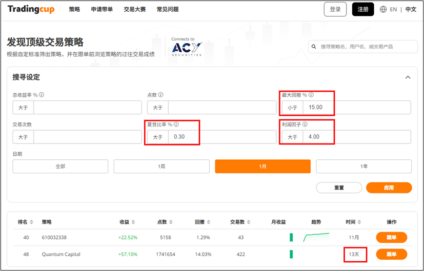 上次我们有提到可以透过新的交易杯网站搜寻功能来找到潜在的带单交易者,这次Gary透过一个较为严苛的条件(如下图1)来寻找。