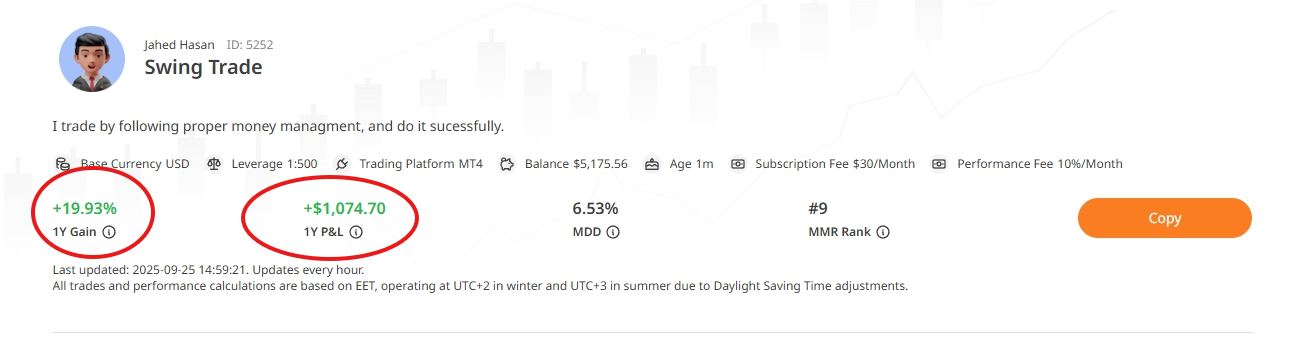 Jahed Hasan emphasizes money management in his self-introduction, and his signal name, “Swing Trade,” suggests a focus on swing trading rather than high-frequency trading.