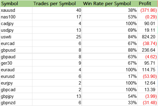 Trading in 15 different instruments, including stock indices like the Nasdaq 100 and German Index (DAX), Forex pairs such as EURUSD, GBPUSD, and cross-pairs like CADJPY and EURCAD, along with commodities like gold and crude oil. This multi-asset approach helps to mitigate the risk of poor performance due to a single asset’s consolidation.