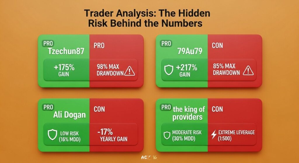 Top Gainer: Purely ranks by Gain % over a period (e.g., 1 year), often filtering for positive gain. Use with caution – high gain can mean high risk. Always check MDD and Sharpe Ratio here. It is tempting to simply sort all traders by the “Top Gainer” filter to see who is making the most money. This is the most direct path to finding traders like Jason Huang. While potentially lucrative, using this filter in isolation is the single most dangerous approach for a beginner. A high gain figure tells you nothing about the risk taken to achieve it.