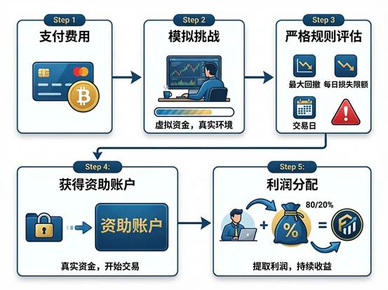 - 评估阶段(挑战赛):支付费用参加“挑战”,在模拟账户上达到盈利目标并严守风控规则。