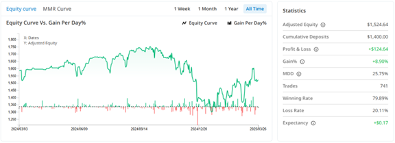 Despite having nearly four years of trading history, the EMAs with fractals strategy experienced intermittent pauses due to capital withdrawals and inactivity, only resuming operations this year. From January to March, its performance remained modest. However, since April, amid heightened market volatility triggered by a new round of tariff threats from Donald Trump, the strategy has demonstrated strong resilience—delivering consistent gains and a steadily rising equity curve.