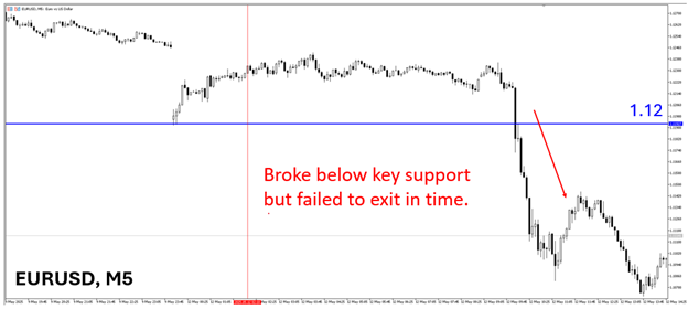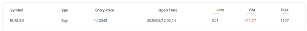 For example, a long signal on EUR/USD issued on May 12 was triggered when the euro briefly found support around 1.12 after a gap-down open. However, as prices continued to fall below this key level, the trade remained open through May 13, accumulating losses without triggering an exit.