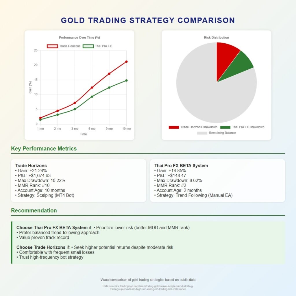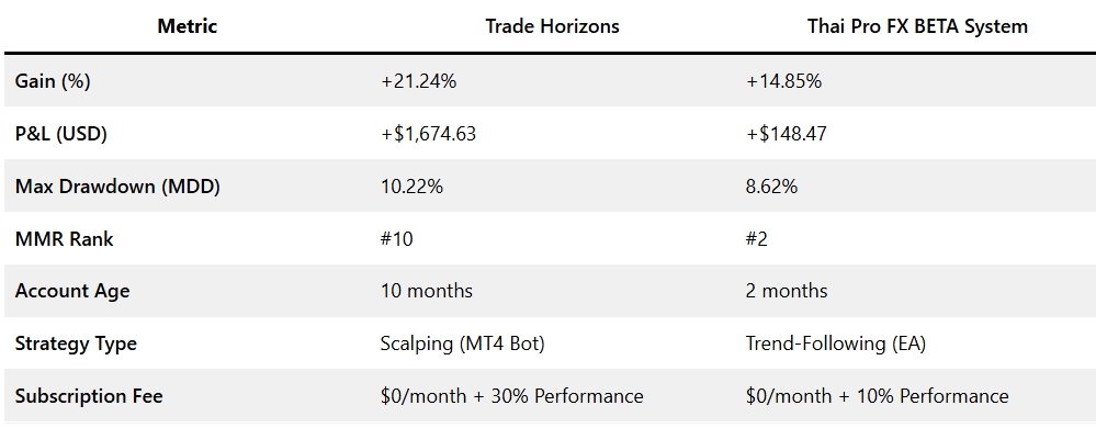 Both strategies use EAs (Expert Advisors), but Thai Pro’s approach appears more robust for long-term sustainability. Verify the historical performance beyond the provided screenshots (e.g., check older trades or live charts) before committing.