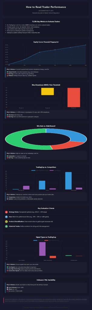 - How to read performance metrics (TradingCup’s guide on reading trader performance is a great start).