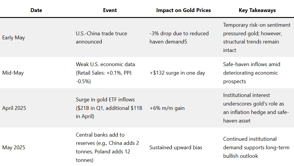 • Early May: A U.S.-China trade truce announcement led to a temporary -3% drop in gold prices due to reduced safe-haven demand. However, structural trends like central bank buying remain intact.