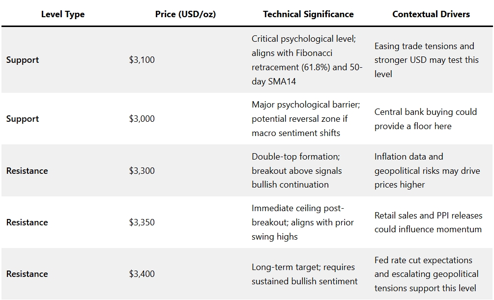 • $3,400/oz: A longer-term target requiring sustained bullish sentiment, potentially supported by Fed rate cut expectations and escalating geopolitical tensions.