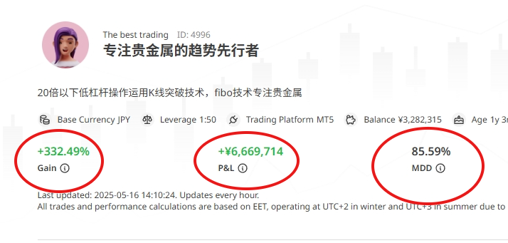 专注贵金属的趋势先行者 (Trend Follower): The gain is eye-catching, but the 85.59% maximum drawdown is a catastrophic risk level for most investors. This means at one point, copiers could have lost over 85% of their invested capital. A $50 monthly fee adds to the pressure to perform. If considering this, the allocation must be a very small portion of risk capital one can afford to lose entirely. Are you comfortable with the potential for such extreme volatility for the chance of high returns?
