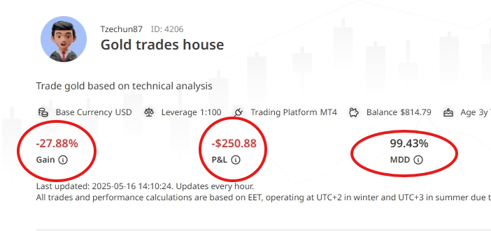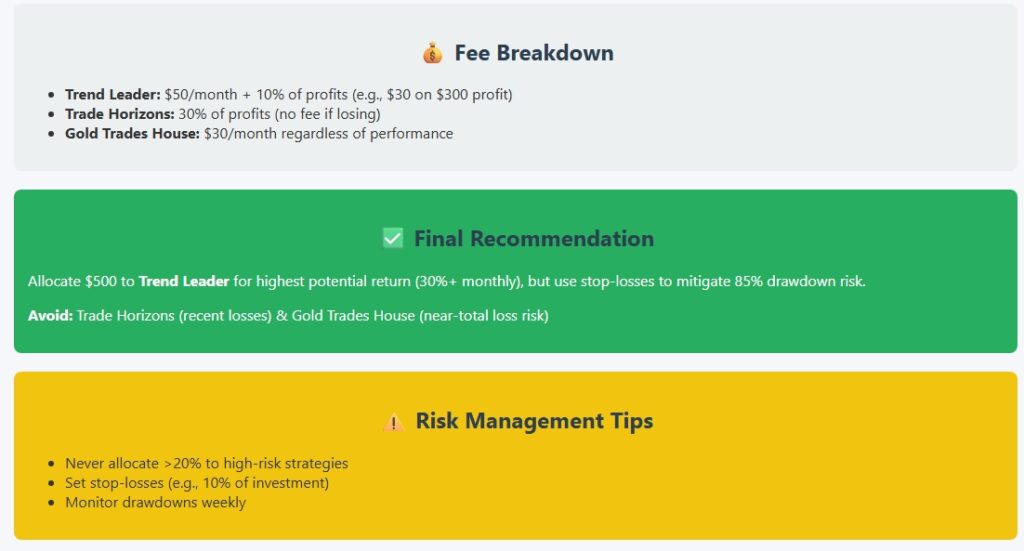 Gold Trades House: Consistent losses and a near-total max drawdown, combined with a monthly fee, make this a clear AVOID. Paying for consistent losses is the opposite of smart money protection.