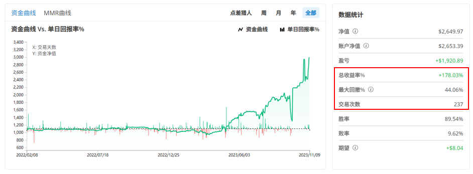 Weiii交易的时间已经有1年9个月,这段期间的总报酬高达178%,但资金开始有明显攀升大概是最近半年的事,他的胜率高达惊人的89%,不过也伴随着比较高的最大回撤(MDD为44%),而且从他将近两年的交易时间只做了237笔交易来看,高机率是一位主观交易者。