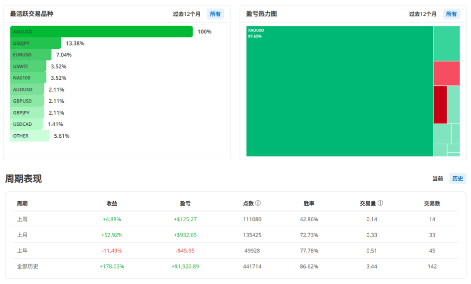 观察Weiii主要交易的商品,果然如他的策略所述,黄金是他最活跃的交易品种,其次是美日货币对和欧美货币对,策略一开始的时候,他也有交易天然气和原油,不过黄金是他主要的获利来源,在他的盈亏热力图只有黄金一枝独秀,可见他对黄金的掌握度有一定把握,将主力的交易产品收敛到黄金以后,也让他今年度的绩效表现愈来愈好。
