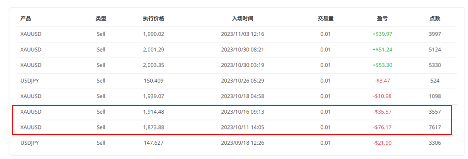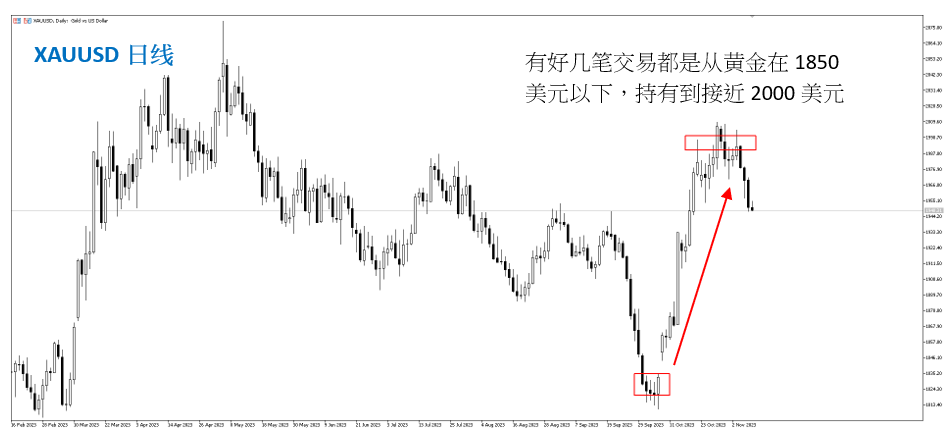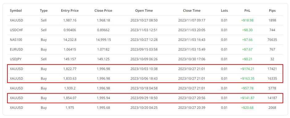 我们就更深入去细看他的黄金交易,最近几笔获利比较好的交易都是从黄金跌到1900以下就开始做多,而且还可以注意到即使在中东地缘政治影响下,黄金在10月份呈现单边上涨,但Weiii还是坚持只下0.01手的交易,我想这就是它的风险控管方式,而且有一点我很佩服的是,他可以把黄金的部位从1900以下抱到接近2000,如果是我可能会因为中间稍有回调就先获利了结,我想这就是他的获利可以持续稳定向上的原因。