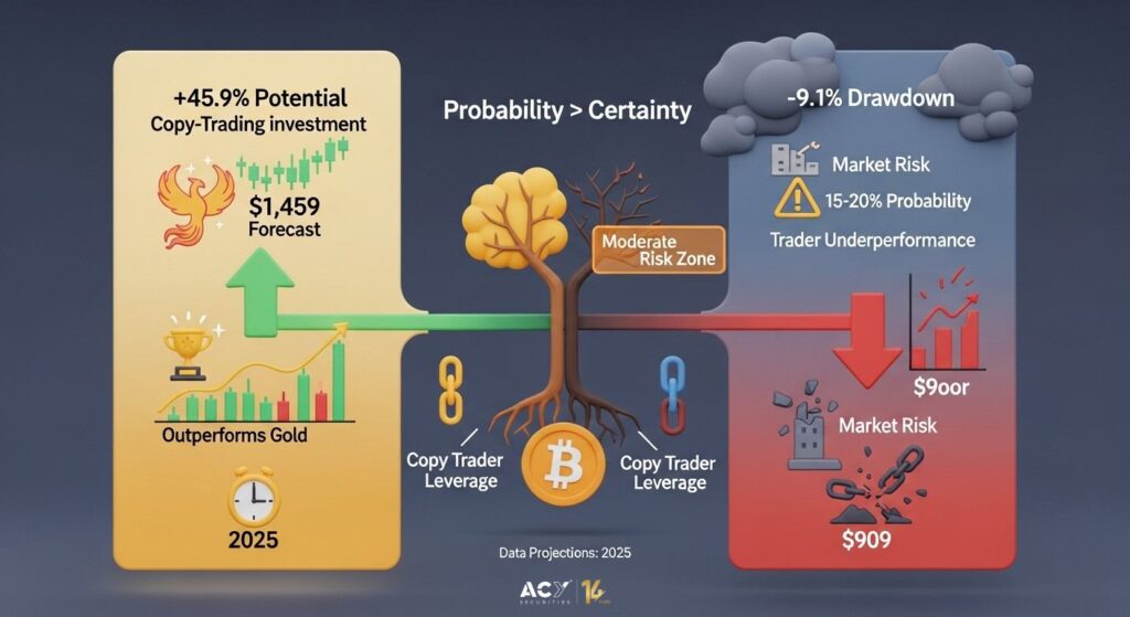 Based on 2025 price projections, your $1,000 could potentially grow to $1,459 if the market hits its maximum forecast. However, if it falls to its projected minimum, your investment could shrink to $909. While the upside is higher than gold’s, the probability of a significant drawdown (over 10%) is moderate, at around 15-20%. This doesn’t even account for the risk of the trader you’re copying underperforming the market.